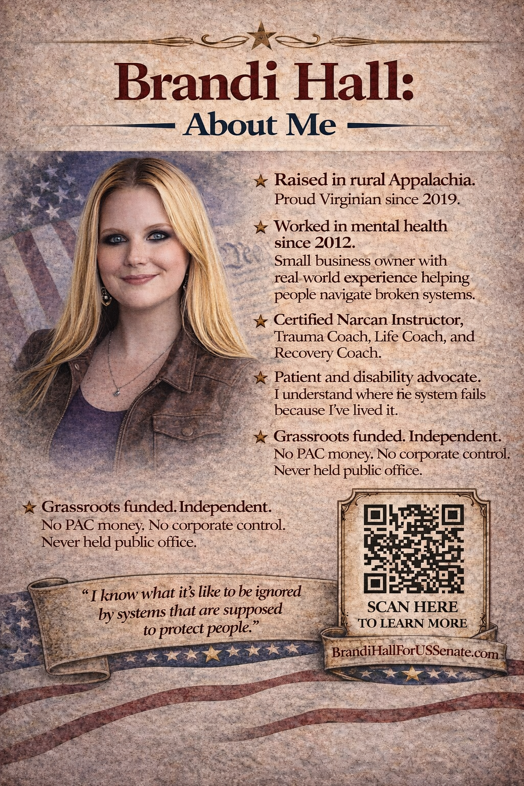 This digital “About Me” card introduces Brandi Hall, Independent candidate for U.S. Senate in Virginia, through lived experience, service, and grassroots leadership.